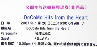 GLAY@渋谷スペイン坂スタジオ 本日16時から渋谷スペイン坂にて公開生放送された TOKYO FM「DoCoMo Hits from the Heart」 観覧に行って来ました〜☆ ゲストはGLAY!! 今回の観覧は抽選方式だったわけですが、 駄目もとで応募したら当選したのです!!(^▽^)v しかも整理番号が60番台で早くてビックリ。w 放送1時間前には集合場所に集合して、 みんなで並んでスペイン坂に向かうのですが、 渋谷の街を歩いてる人やコンビニで雑誌を立読みしてる人とかが 「なんだ?この行列?」って感じで行列を見てました。w 去年の7月にスペイン坂に来た時は暑くて、 しかも途中で一時的に「どしゃぶり」になって(苦笑) 大変だったわけですが、今回は最初から雨…寒い…。 てか朝、横浜では初雪が降ったとか??…わぉ。 どうりで寒い訳だ。。。 でもGLAYさんに逢う為に耐えましたよ!(><) 20人位ずつ観覧ができるのですが、私の番が回って来た時は、放送開始10分経ったか、経ってないかぐらいの割と早い時間でした。 ラジオ聴いた人なら分かると思いますが、なんか試験勉強のお話してましたよ。 ヒサシさんの声聴けた〜♪(*´∇`*) てか憧れの人が直ぐ目の前で喋ってる…なんか不思議な感じ。。 んで直ぐその後「100万回のKISS」がかかりました。 そしたらファンの皆が拍手をしたかと思うと、 メンバーに向かって一斉に手を振り始めたという。w 私も負けじと参戦しました。w メンバーも手を振り返してくれましたが、なんかね、 一瞬タクローさんがこっちを向いてくれた気がした!(〃▽〃) ぁ、気がしただけですよ。気がね。。。…てかね、去年同様、タクローさん以外の3人、サングラスかけとるやん。_| ̄|○ ガクーリ それじゃ、どこ見てるのか分からんがな。苦笑。 もぅ、3人とも照れ屋さんなんだから〜w(そうなのか?) ちなみに衣装は全員黒系で。 テルさんは去年同様「G4」の時によくかけてた赤フチの大きいサングラス。 しかも首にはマフラーぐるぐる巻き。どっかで見た事ある格好だなぁ。w ヒサシさんもサングラス着用で。 かろうじて、うっすらアノ細い目が見えました。(/ω\*) ジロウちゃんは白フチの濃いめのサングラス。全然何処見てるのかわからん。('A`) ちなみに席順は去年同様、 タクローさん、テルさん、ヒサシさん、ジロウちゃんって順番。 相変わらずヒサシさん、細かったなぁ〜(*´∇`*) んで話の続きですが、 曲が半分いったか、いってないか位で時間切れ。 追い出されました。…早。 なんだか、あっという間で去年よりも短い気がしました。(´д`) とりあえず出る時もまだ曲が流れてる最中だったので、 最後の最後までメンバーに手を振ってたら、 なんと!タクローさんが気づいてくれて、 こっちを見て「じゃあね」(^-^)ノ って仕草をしてくれましたっ♪(*・艸・*) タ、タクローさんと目が合ってしもうた。(*・艸・*) 幸せ。(*´∇`)。・:*:・゚'☆ (ぁ、石投げなぃで・・・苦笑) 公開生放送の観覧、去年は初めてメンバーをあんな近くで見て、 超近っ!どうしよう!?(><)って感じだったけど、 その去年に比べたら二度目という事もあってか、 今回の自分は割と冷静だったなと思います。 なんか近過ぎ&ガラス越しなのでテレビ見てるみたいな感覚。w しかも先週LIVEで逢ってるし。w こんな短期間でGLAYに3度も逢っちゃっていいんだろうか。。。 にしても今回はタクローさんにやられました。惚れました。w 3度目の当選は流石に難しいだろうけど、またスペイン坂に来て欲しいなぁ。 その時は是非サングラス無しで。w 他の3人のお顔もちゃんと見たいっす(><) [0回]