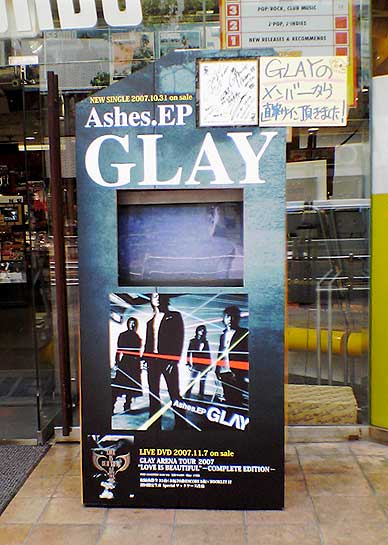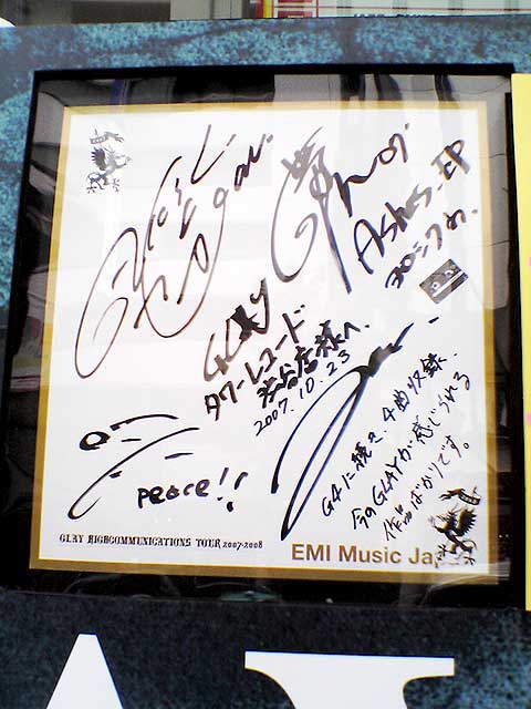 GLAY@渋谷スペイン坂スタジオ ■11月3日(土)T-FM「DHC COUNTDOWN JAPAN」 公開生放送に行ってきました !!(・∀・)毎回抽選なのですが、奇跡の3連続当選です。てかなんか当たる様な気がしてた。w12:30 スペイン坂スタジオ集合だったのですが、 少し早めについたので、渋谷のタワレコへ。 ここにGLAYのサインがあるって聞いたので、 どこにあるんだろう?と思ってたら、 店頭にドカンと置いてありました。w 写メOKって書いてあったので、撮ってきました。 一人店頭でケイタイかざしてるのが ちょっと恥ずかしかったけど その後、ディズニーストアで買い物してからスタジオへ。 今回190番台だったので、 スタジオから少し離れた道沿いに並ばされました。 今回は当選したのは300人だったんですね。 前回は600人位だったらしいので、人数減らしたんですね。 (の割には相変わらず観覧時間短かったけどな…) それでも当たっちゃうワタシってラッキー でも今回当たった人って前回当たった人が多かったみたい。 やっぱりこういうのって住所とか関係してるのかな??? 私の観覧した時間帯は13:30頃、番組中盤あたりでした。 そのグループの先頭だったので、直前になって緊張してきちゃったけど、 いざ、中へ突入してみると、あぁなんか… デッカイ、クリアなテレビを観てるみたいな感覚でした。w 相変わらずテレビで観るGLAYそのまんまですよ。 なんか、もう公開生放送慣れちゃった。爆。 てかね、荘口さんとトーク中だったので コチラに対するリアクションも特になく…時間切れみたいな 前回は曲流してる途中だったので、 手を振ってくれたりしたんだけどな〜ちょっと残念。 席は奥からテルさん、ヒサシさん、ジロウちゃん、タクローさん。 衣装はみんな黒い服でテルさん以外サングラス。 今まではタクローさん以外サングラスだったので、 やっとテルさんのお顔が見れた!(・∀・)みたいな。w できればヒサシさんのお顔も拝みたい!って思うけど、 ヒサシさんは今後も絶対サングラスは取らないだろうなぁ…。 あとジロウちゃんのあのお顔の可愛さっぷりも堪能したい。w そういえば、私のグループの2個前のグループの時、 すっごい「キャー!!」って黄色い声が飛びまくってたんですけど、 一体何があったのさ!?気になります(><) さらに皆凄い声出すから(&凄い列だから)通りすがりの人々が 「誰が来てるんですか?」と尋ねてました。w 終わった後は、せっかく渋谷まで来たのでお買物してから帰りました。 昔は渋谷は苦手だったけど、少し慣れてきたかも。w [0回]PR
