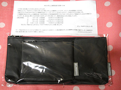 B'z PARTY 継続記念品 先日、B'z PARTY 継続記念品が届きました。もう入会して9年目になるそうで。今回はビニールポーチだったんですが、B'z PARTYの継続記念品って、シンプルなデザインな物が多く、普段使いに適しているので、ありがたいです。B'z LIVE-GYM Pleasure 2013 -ENDLESS SUMMER-2013/09/21 日産スタジアム S席無事当選しました。昔、20周年記念日のスタジアムライブでダブらせた事があるので、今回も余裕かな?と思ったんですが、今回はかなり激戦だったようで(汗FC先行の段階で無事取れて良かったです。まぁ、スタジアムクラスなんで先行のチャンスはいっぱいあるんですけどね。ラジオとかテレビとか(これを書いてる今もTVKで先行やってるw)チケ代も振り込んだので、あとは当日を待つだけです。・・・嵐だけは止めてね、稲葉さん(笑 [0回]